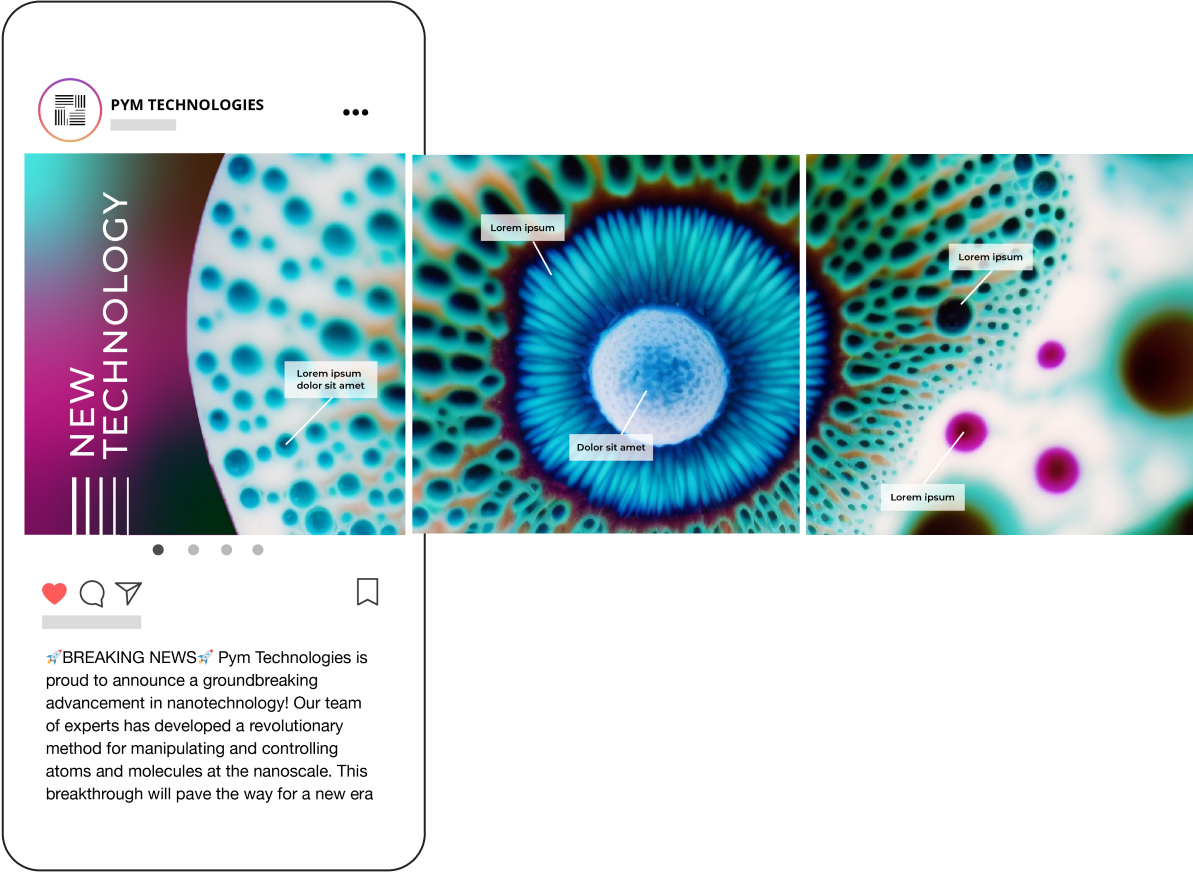 Jessica: For the Instagram post, I thought about making a design with a hand holding a small piece of technology, but Midjourney has a lot of trouble making realistic hand options. I decided a more compelling visual would be a zoomed in shot of a molecule or cell. I inputted a stock image of a cell and (after a lot of iterating and tweaking) it gave me a few really cool images.