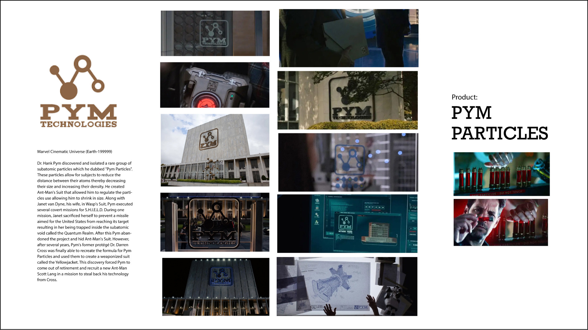 Sebastian: I also didn’t know anything about Pym Technologies. Of course, it's a company in a movie, but when I researched it, I found there's no consistency in its brand. So, I started with a research and discovery phase. I pulled together a lot of images and background information. My big discovery was finding out its main product: Pym Particles. It’s this red substance that manipulates the space between particles, allowing an object to be larger or smaller—it’s basically the stuff that makes Ant-Man!