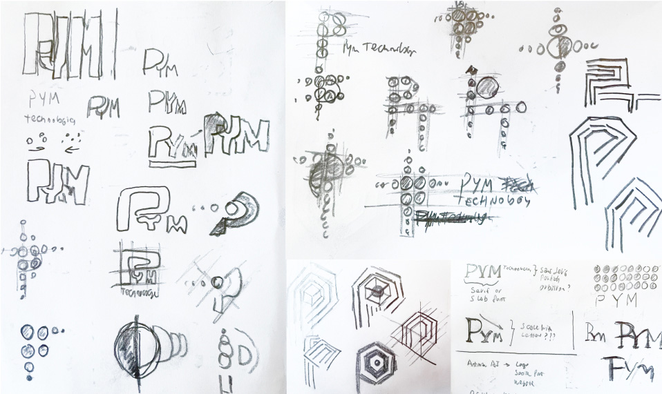 Sebastian: Once I had an overall sense of the company, I needed to create a brand identity—basically, a mood board. I played around with gradients, shapes, and typography. I also found photography and began dropping all these elements into a mood board. I wanted the brand to feel futuristic and scientific, like an advanced technology company, but also microscopic because Pym’s core product was all about playing with particles. I also messed around with logo ideas. I sketched out different concepts. The logo had to evoke changes in space because the product is all about making the space between particles smaller or larger.