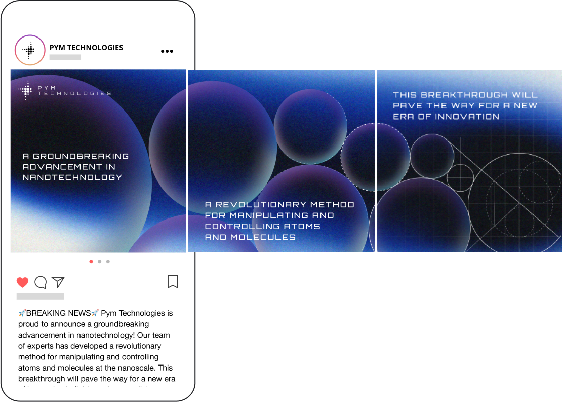 The last step was to make social assets. For the job listing on LinkedIn, I thought it was important to show a human face. For the breakthrough announcement on Instagram, I went back to the shapes and gradients in the brand identity and imagined the post as a multi-frame swipe, leading to smaller and smaller circles (like particles!).