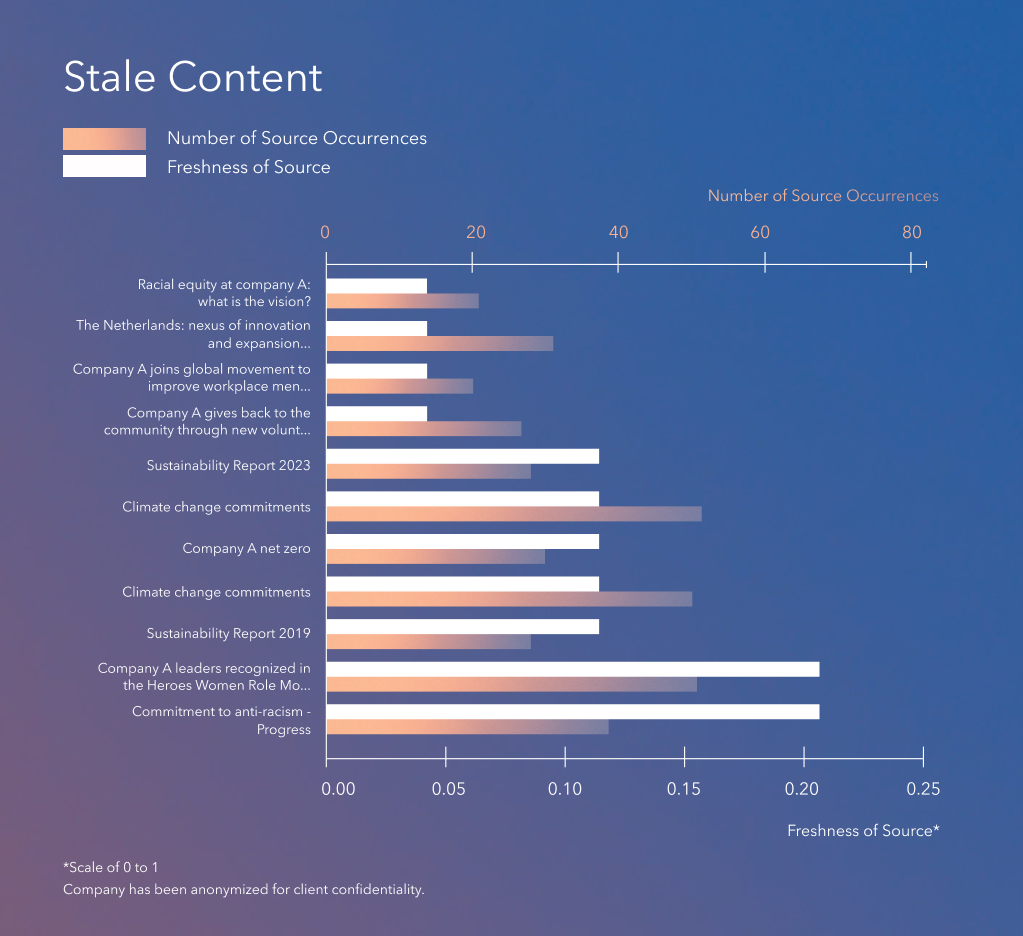 Take a look at the chart below. GXM’s Stale Content Tracker audits and identifies which assets in your library are actively in the way of serving your audience. Like the Reliability Score for content gaps, “Freshness” is determined through a multi-factor model, including factors like the age of the content, the last time it was updated, the presence of broken or outdated links (i.e. link rot), and whether newer, more accurate content has effectively superseded it—especially if it contradicts or replaces the original material. Ultimately, if a piece of content scores below .25 on a 0 to 1 scale, we consider it stale.