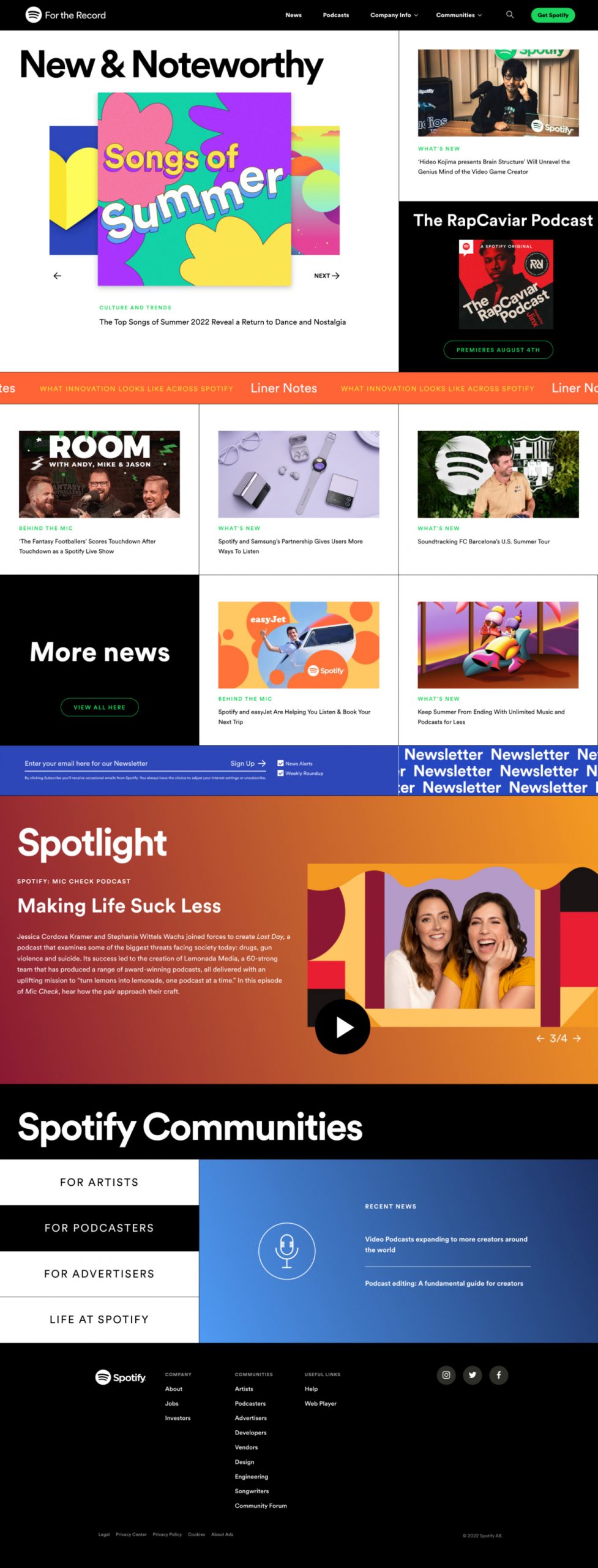 In 2021, SJR designed and developed a refresh of For the Record with a new hub model in mind. Using a content feed that pulls from other Spotify community sites, we created a connected storytelling ecosystem for the company and its varied audiences.